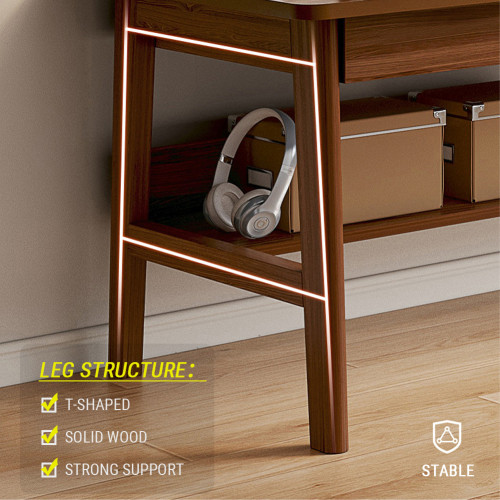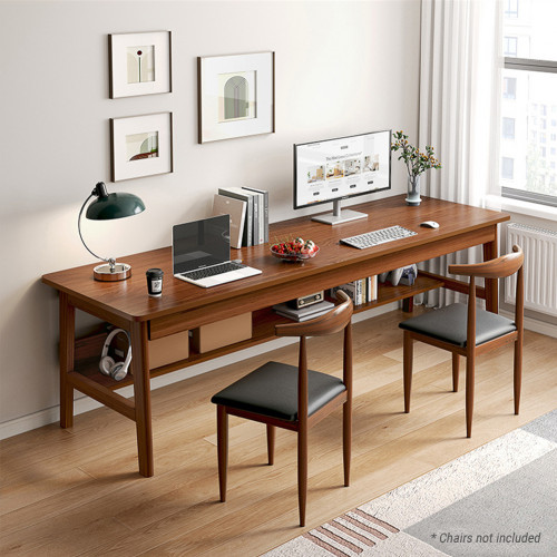 This long desk is used for home office work and study,  with a modern minimalist appearance, and is made of solid wood legs and MDF panels.